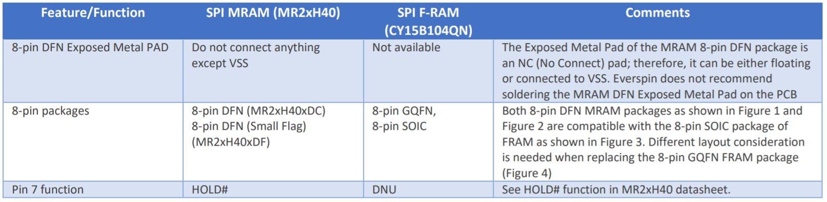 MR2xH40xDF是組織為512Kx8的4Mb非易失性RAM,采用標(biāo)稱3.3V電源供電,并且與FRAM兼容。它提供標(biāo)準(zhǔn)的8引腳小標(biāo)志DFN(DF版)和8引腳DFN(DC版),它們是多功能封裝選項(xiàng),可以用SPI-FRAM8引腳SOIC和8引腳GQFN替代它。包(表1)。從硬件的角度來(lái)看,關(guān)鍵的區(qū)別在于用于封裝引腳(引腳7)的PCB的變化。從軟件的角度來(lái)看,這兩個(gè)設(shè)備之間的主要區(qū)別在于引腳7的功能和設(shè)備ID。當(dāng)主機(jī)CPU必須中斷存儲(chǔ)器時(shí),使用MR2xH40xDF的HOLD#引腳(引腳7)另一個(gè)任務(wù)的操作。當(dāng)HOLD#為L(zhǎng)OW時(shí),當(dāng)前操作被掛起。設(shè)備將忽略SCK或CS#上的任何過(guò)渡。當(dāng)SCK為低電平時(shí),必須在HOLD#上進(jìn)行所有轉(zhuǎn)換。如果不使用,此引腳必須連接到VDD??赡苄枰挠布蛙浖拍茉贛RAM上啟用HOLD#功能。