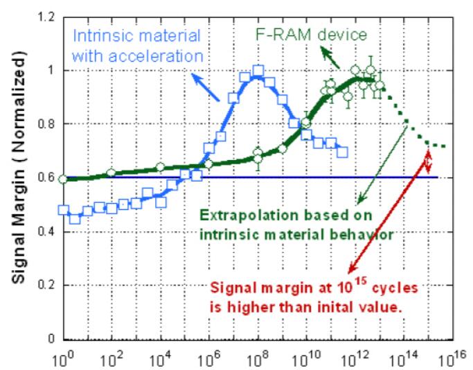 當(dāng)前對(duì)0.13μm FRAM的1015個(gè)周期的耐用性規(guī)范基于對(duì)使用0.13μm技術(shù)節(jié)點(diǎn)構(gòu)建的并行FRAM核心存儲(chǔ)器產(chǎn)品的樣本中1,280位FRAM存儲(chǔ)器的初步評(píng)估。圖1顯示FRAM設(shè)備級(jí)信號(hào)容限在1012和1013個(gè)周期之間達(dá)到最大值。根據(jù)本征材料對(duì)0.13μm