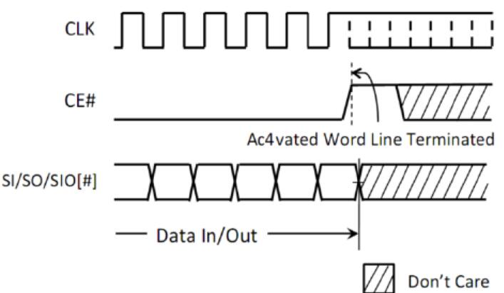 所有所有讀和寫都必須由CE#從低到高完成。CK#的上升沿是終止已激活的讀/寫字線并將設備設置為待機狀態(tài)的觸發(fā)器,否則將阻止內部刷新操作,直到設備看到讀/寫字線已終止,無需執(zhí)行命令終止操作僅適用于讀取和寫入操作以及任何命令操作,例如Enter Quad模式命令和Reset命令。
