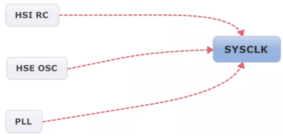 5、SYSCLK時(shí)鐘源有三個(gè)來(lái)源:HSI RC、HSE OSC、PLL