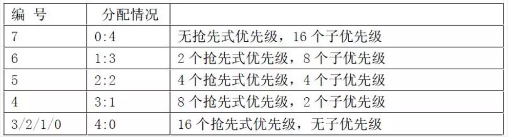20、(NestedVectored Interrupt Controller)NVIC嵌套向量中斷控制器,分為兩種:搶先式優(yōu)先級(jí)(可嵌套)和中斷優(yōu)先級(jí)(副優(yōu)先級(jí),不能嵌套)。兩種優(yōu)先級(jí)由4位二進(jìn)制位決定。分配下來(lái)有十六種情況: