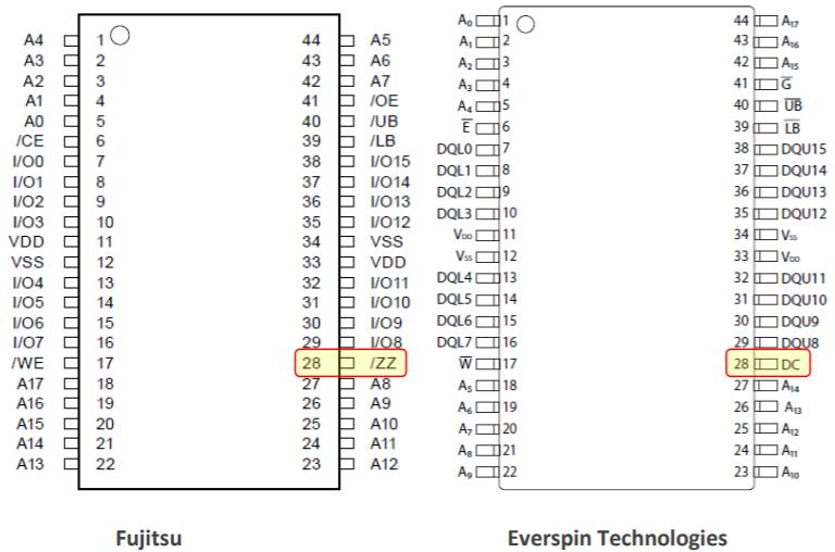 MRAM,組織為256kx16,由標稱3.3V電源供電,并與FRAM兼容。兩款產(chǎn)品均使用標準SRAM并行地址(A0-16)、字節(jié)寬雙向數(shù)據(jù)引腳(DQ0-7)和控制信號(/E、/W、/G)。每個都可以由一個公共定時接口支持,并將用作隨機存取讀/寫存儲器,在斷電時無需外部電池即可保留數(shù)據(jù)。Everspin不支持/ZZ睡眠功能。/ZZ可能需要上拉。