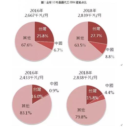 因此2018年中國(guó)企業(yè)規(guī)劃的新增產(chǎn)能目標(biāo)將可能難以實(shí)現(xiàn),預(yù)期下修到7.2萬片,其中中國(guó)廠商的先進(jìn)制程(28nm含以下)產(chǎn)能約1.2萬片,占新增產(chǎn)能近17%,預(yù)計(jì)2018年中國(guó)自主非存儲(chǔ)器產(chǎn)能將占全球非存儲(chǔ)器產(chǎn)能比重約6.7%。