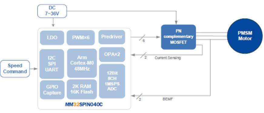 方案采用的主控MM32SPIN040工作頻率可達48MHz,內(nèi)置16KB Flash,2KB SRAM高速存儲器,針對電機應用內(nèi)置2個運放,預驅(qū)工作電壓高達36V。適合于三相永磁無刷電機,電動工具等多種應用場合。該方案適用于落地扇、塔扇、循環(huán)扇、吊扇等多種品類的風扇設備。我司英尚微可提供高速吹風筒、電扇等各種電機應用方案。