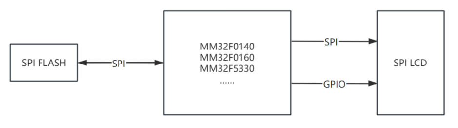 靈動(dòng)微推出的SPI LCD顯示參考方案,通過(guò)SPI接口讀取外部SPI FLASH存儲(chǔ)芯片中存儲(chǔ)的字體、圖片等數(shù)據(jù)資源,再通過(guò)另外一路SPI驅(qū)動(dòng)SPI LCD彩屏顯示。對(duì)于不同尺寸、不同分辨率的 SPI LCD 彩屏,客戶可以選擇靈動(dòng)微電子不同規(guī)格的MCU來(lái)實(shí)現(xiàn)刷屏效果,硬件設(shè)計(jì)框圖如下所示: