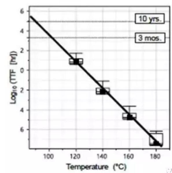 圖3.一組1Gb裸片的數(shù)據(jù)保留(DR)烘烤的失效時(shí)間與溫度的關(guān)系。實(shí)線擬合表示在85°C情況下為10年的DR,在100°C情況下為3個(gè)月的DR。