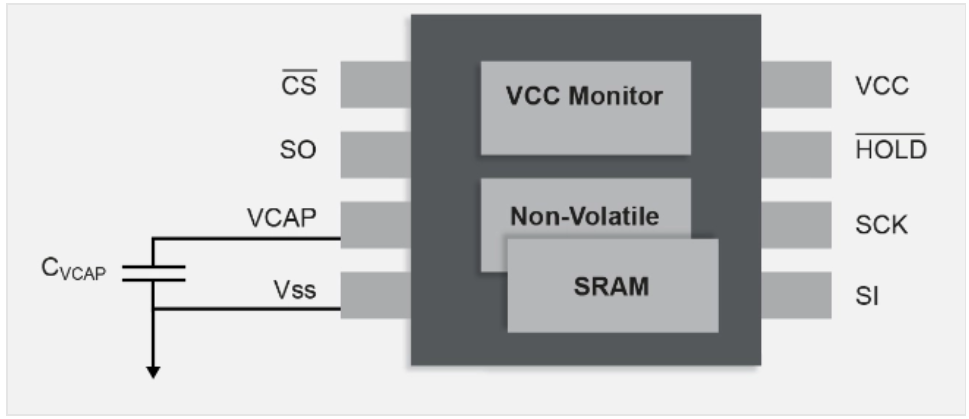 串行SRAM,在器件內(nèi)部的每個(gè)單元中都包含非易失性晶體管。與NVSRAM不同,它不需要外部電池。它使用一個(gè)小的外部電容器來(lái)提供當(dāng)系統(tǒng)斷電時(shí)將SRAM的內(nèi)容移動(dòng)到非易失性單元所需的能量,這是通過(guò)IC監(jiān)視公共集電極上的電壓并自動(dòng)處理SRAM和SRAM之間的數(shù)據(jù)移動(dòng)來(lái)實(shí)現(xiàn)的。必要時(shí)使用非易失性存儲(chǔ)器。