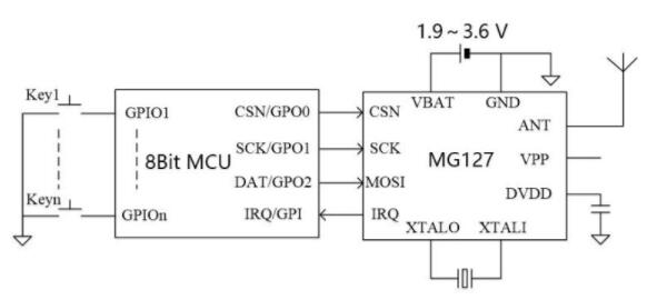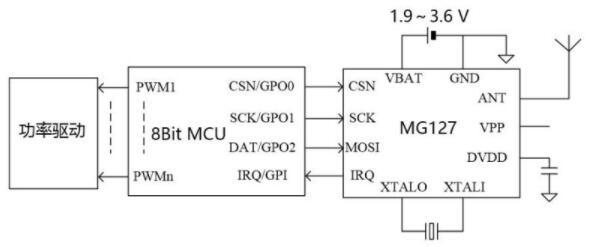 藍(lán)牙芯片MG127是具有低功耗、低成本的BLE 收發(fā)器,內(nèi)部集成了發(fā)射機、接收機、GFSK 調(diào)制解調(diào)器和BLE 基帶處理。電源電壓1.9~3.6,可以采用一個紐扣電池(3.0v)供電,具備3uA待機電流,20mA@0dBm持續(xù)發(fā)射,18mA持續(xù)接收等特點。MG127 采用DFN3x3 封裝,只需搭配低成本MCU 和少數(shù)外圍被動器件,即可實現(xiàn)BLE 遙控、藍(lán)牙電子秤等應(yīng)用。