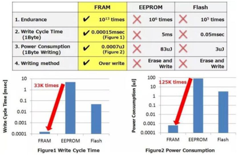 FRAM、EEPROM、FLASH工作電流與消去時間對比