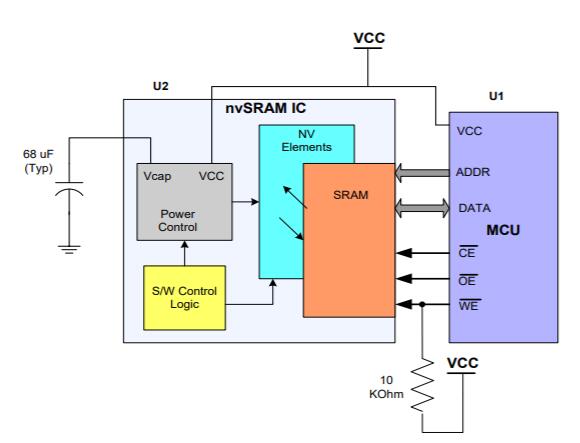 高速SRAM單元提供了非常高速的讀寫訪問,并且可以像標(biāo)準(zhǔn)SRAM中一樣無限次地寫入或讀取NV-SRAM。如果斷電則利用存儲在與NV-SRAM的VCAP引腳相連的小電容器中的電荷將SRAM中保存的數(shù)據(jù)傳輸?shù)脚c每個SRAM單元集成的非易失性元件。 NV-SRAM VCAP引腳上需要的電容器只有幾十µF,典型值為68 µF(有關(guān)VCAP的允許范圍,并在上電期間通過內(nèi)部充電電路進行充電。 VCAP上存儲的電荷足以在掉電期間將SRAM數(shù)據(jù)復(fù)制到非易失性元件(稱為存儲操作)。