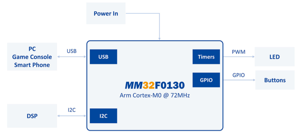 靈動微MM32F0133C7P整合USB接口與豐富的資源,在設(shè)計外接聲卡時能與DSP做連接與溝通,此外USB界面通過USB-IF certificate,無論是在接到Host端的PC/NB,Game console與Smart Phone都可以有良好的兼容性。