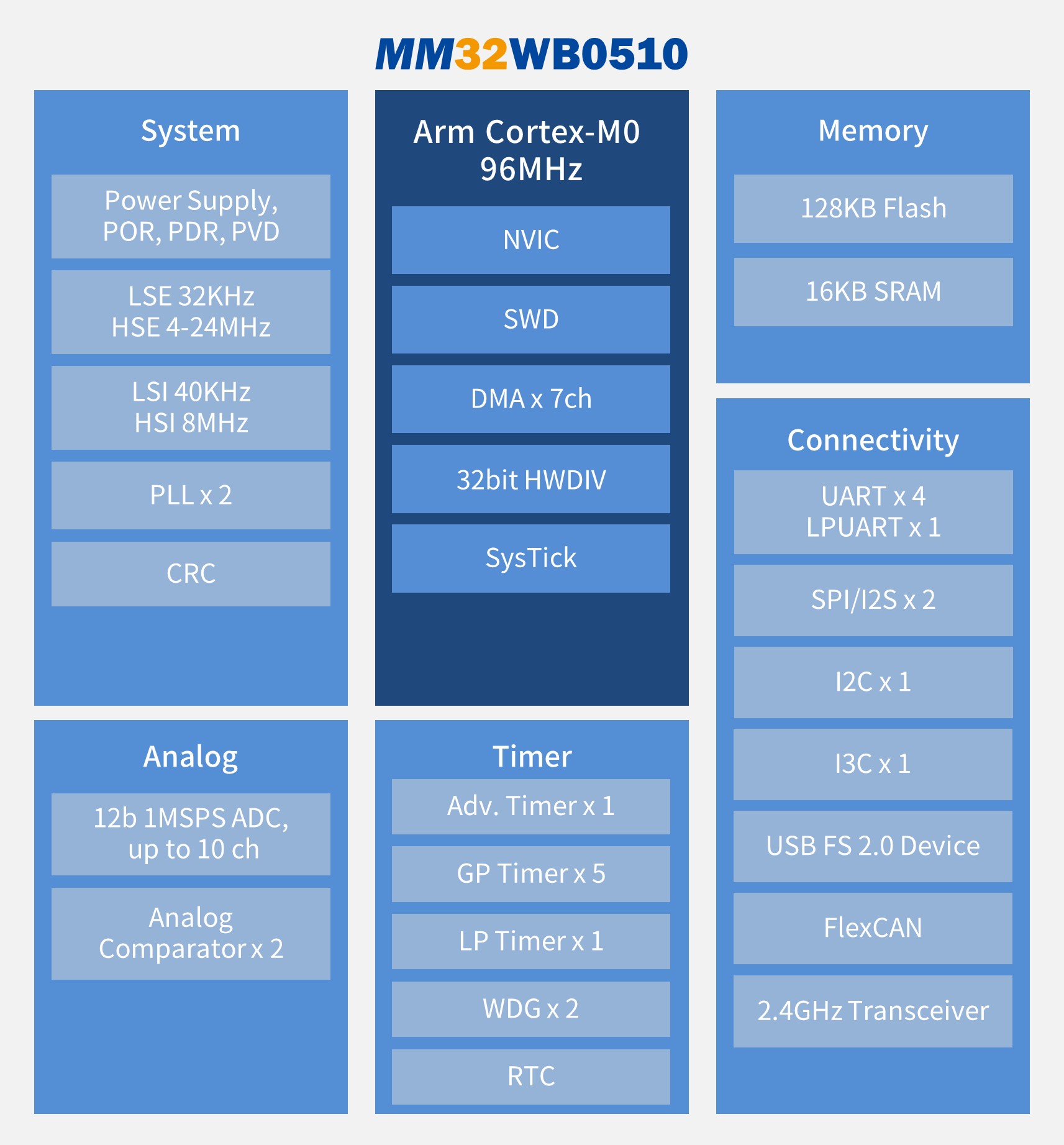 MM32WB0510搭載Arm Cortex-M0內(nèi)核,主頻可達(dá)96MHz,內(nèi)置128KB Flash和16KB SRAM,并集成了USB和FlexCAN接口,面向智能家居,鍵鼠,消防現(xiàn)場(chǎng)部件,電力電子,汽車OBU,汽車傳感器等無線和多接口類型的應(yīng)用。可選封裝形式包括:LQFP64,LQFP48,QFN48和QFN32。