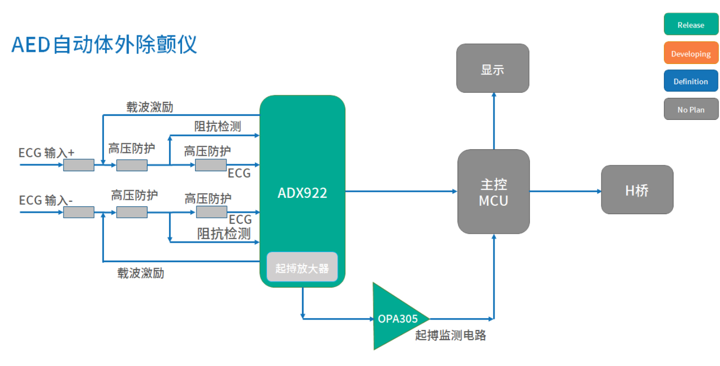 自動體外除顫器(AED)是心臟驟停急救中快速對患者心臟實施電擊來達到除顫,可以幫助普通人快速實施除顫。類比的ECG模擬前端可以快速準(zhǔn)確地監(jiān)控患者的心臟狀態(tài),來實施準(zhǔn)確高效的除顫效果。