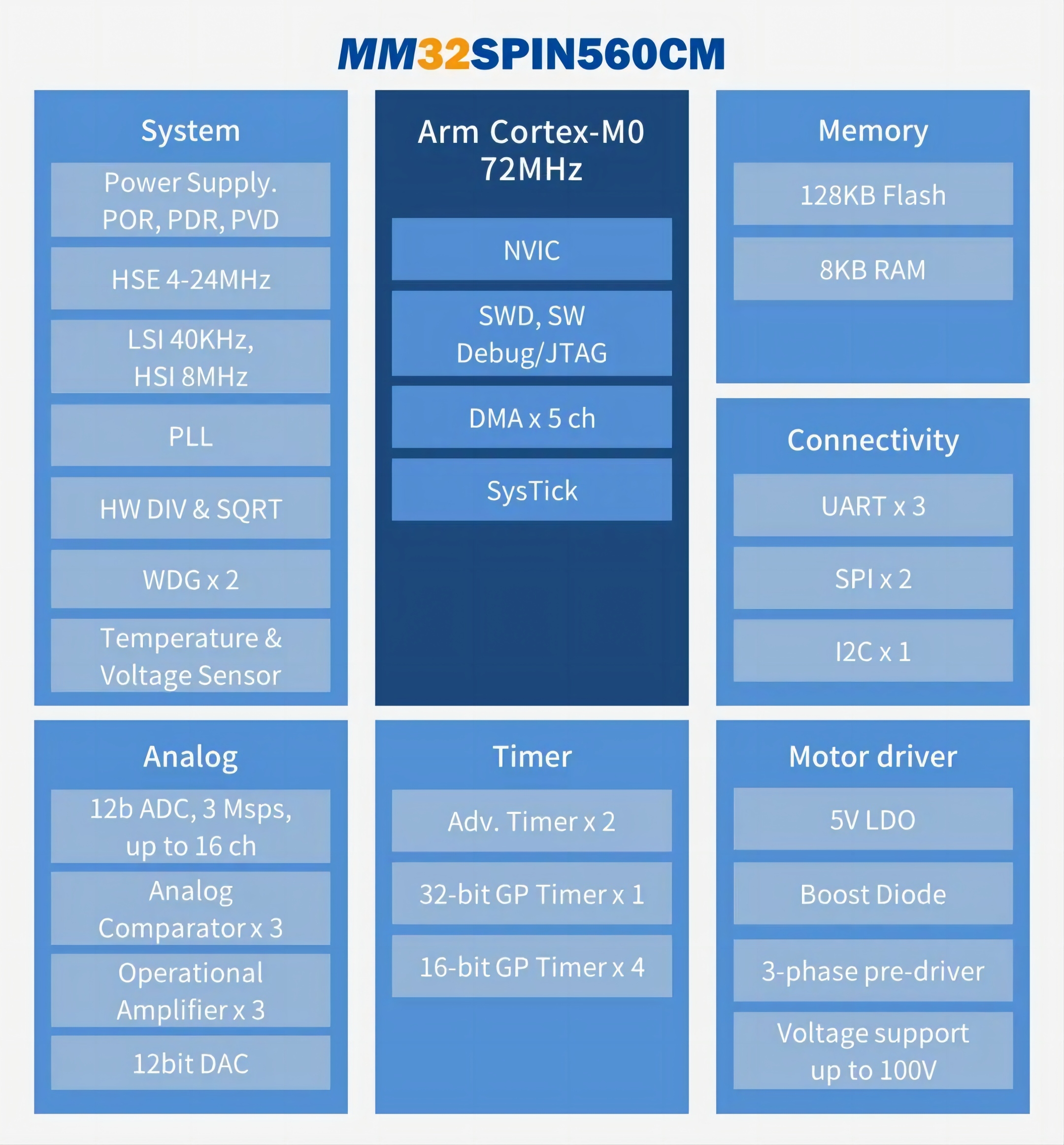 MM32SPIN560CM集成100V耐壓6N預(yù)驅(qū),通過AEC-Q100認證,使用高性能的Arm®Cortex-M0為內(nèi)核的32位微控制器,最高工作頻率可達72MHz。
