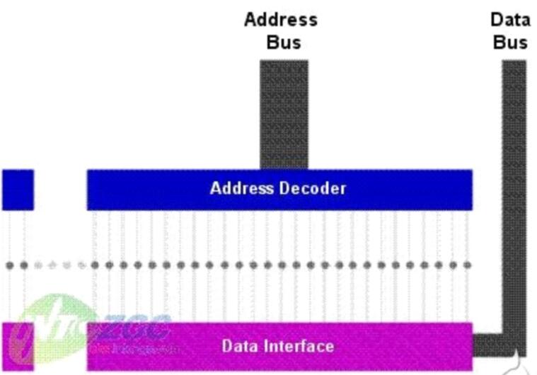 上圖中的小圓點代表RAM中的存儲空間,每一個都有一個唯一的地址線同它相連。當?shù)刂方獯a器接收到地址總線傳送來的地址數(shù)據(jù)之后,它會根據(jù)這個數(shù)據(jù)定位中央處理器想要調(diào)用的數(shù)據(jù)所在的位置,然后數(shù)據(jù)總線就會把其中的數(shù)據(jù)傳送到中央處理器。