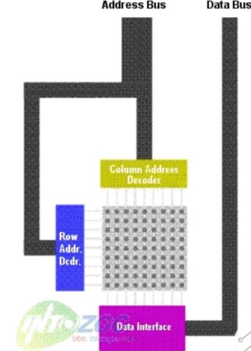 如果RAM對于CPU來說僅僅是一條“線”的話,還不能體現(xiàn)實際的運行情況。因為如果實際情況真的是如此的話,在實際制造芯片的時候,會有很多實際的困難,特別是在需要設計大容量的RAM的時候。所以一種更好的能夠降低成本的方法是讓存儲信息的“空格”排列為很多行--每個“空格”對應一個bit存儲的位置。如果要存儲1024bits(2^10)數(shù)據(jù),那么你只要使用32x32(2^5*2^5=2^10)的矩陣就能夠達到這個目的了。很明顯一個32x32的矩陣比一個1024bit的行設備更緊湊,實現(xiàn)起來也更加容易。請看圖2.