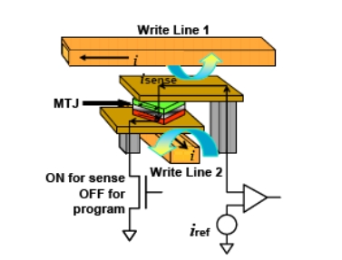 實現MRAM可靠存儲的一個主要障礙是高位干擾率。對目標位進行編程時,非目標位中的自由層會被誤編程。目前飛思卡爾半導體研究人員已經成功解決了此問題,其方法是,在每次出現位狀態(tài)空翻時,產生一個跳變位,它將磁矩的方向旋轉到同一方向。寫入線1和寫入線2上的反轉脈沖電流使極性旋轉,從而不會干擾相同行或列的其它位元。