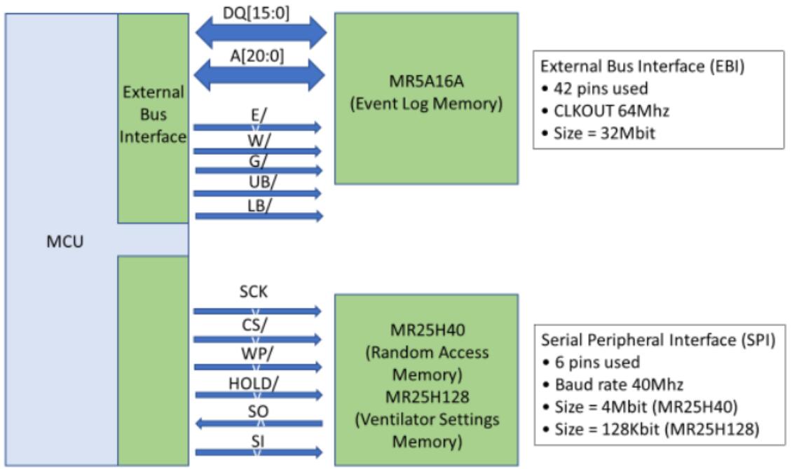 至少4Mb (MR25H40)的MRAM可用于存儲操作軟件程序變量。存儲在MRAM的數(shù)據(jù)在呼吸機關(guān)閉期間保存。