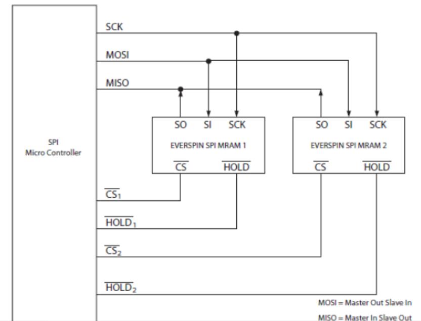 單個或多個器件可以連接到SPI總線,如下所示。引腳SCK,SO和SI是常見的設(shè)備。每個器件都需要分別驅(qū)動CS和HOLD引腳。